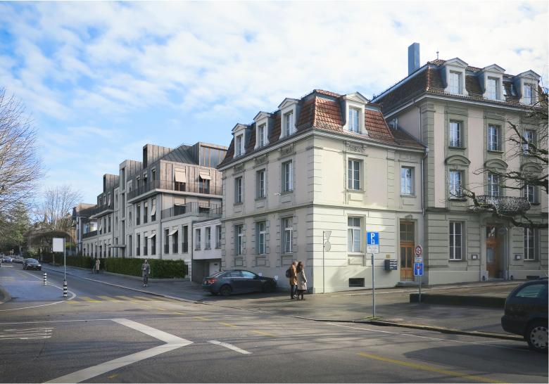 Das bestehende, ursprünglich als Druckerei gebaute Gebäude wurde in den 60-iger Jahren vollständig neugestaltet. Durch den Umbau soll die Erscheinung des Gebäudes wieder einen Bezug zum Ursprungsbau von 1889 erhalten. Wenige, rohe Fassadenmaterialien und reduzierte Details geben dem Gebäude eine dezente Eigenständigkeit und lassen es nicht als Nachbau erscheinen.