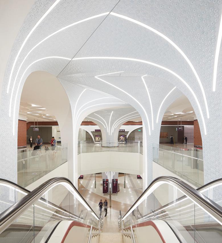 The use of this uniquely Qatari ornamentation and material palette assists in dividing the large interior spaces and guiding pedestrians towards the transient spaces. The integrated light lines amplify the experience, function as natural wayfinding elements and contribute to a unique ambience for the Metro Network.