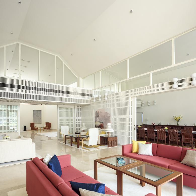 The interiors were designed by interior architect Antti Nurmesniemi in collaboration with the Pietiläs and the landscape design on the compound is by landsacpe architect Maj-Lis Rosenbröijer and the Pietiläs. The large ceramic bas-relief in the Ambassador’s residence is by ceramic artist Rut Bryk.