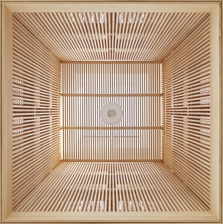 Die Anmut des feierlichen Raumes kann dadurch im Großen wie im Kleinen stets erhalten bleiben. Die Geborgenheit des gemeinsamen Daches wird im Innenraum durch die Vierung der Firstbinder mit neun Lichtfeldern überhöht. Das Himmelslicht wird von einem Filterwerk aus filigranen Holzleisten in heimischer Weißtanne gerahmt. Das helle Holz steht im Kontrast zur grauen Holzschalung und verleiht dem Gemeindezentrum in der Reflexion des einfallenden Lichts eine warme und feierliche Atmosphäre.