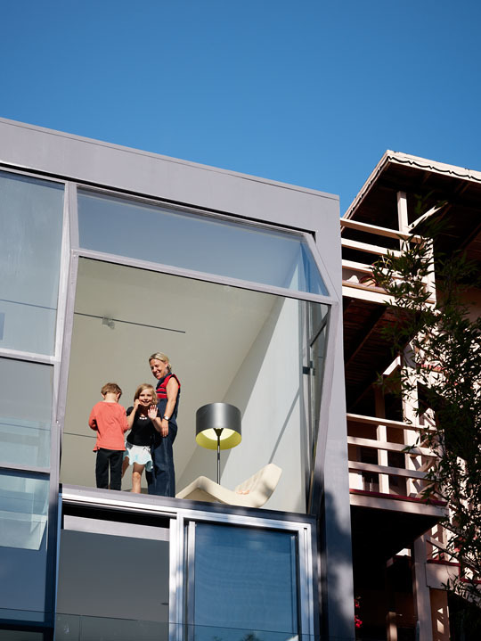 Like many San Francisco homes, this one poorly integrated its many levels with each other and with its sloping topography and solar orientation. Reversing its reading, we recast the back of the house as its primary façade with a faceted, custom-built glass wall. Divided into three vertical panels that push in and out, this dynamic prism brings animating light and spectacular views to the communal living spaces, now placed at the rear. Bedrooms were flipped to the front.