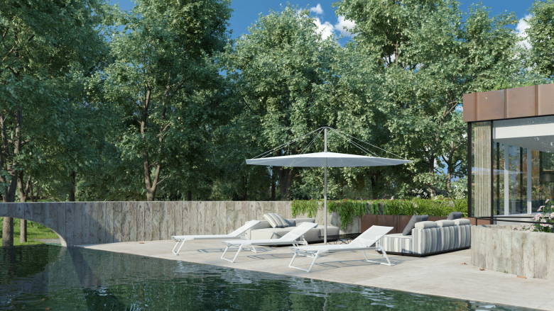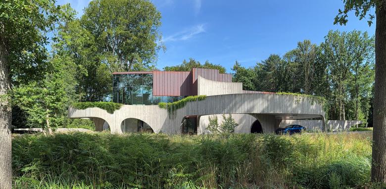The design plays with contrasts: the geometric base shape of the house is refined by the organic curves of the floating terraces and hanging gardens. Materials such as patinated red copper and wood-structured concrete enhance this contrast, creating a harmonious blend of architecture with the natural environment.