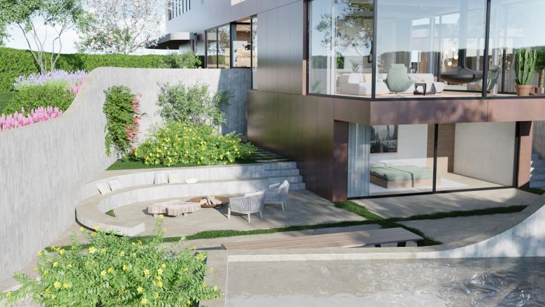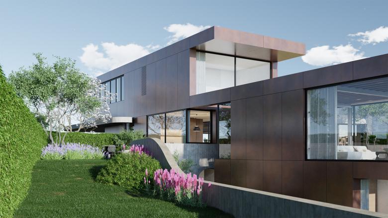 Simple materials such as timber boards, cast concrete, and patinated red copper lend a restrained yet characterful unity to the design. The home’s geometric rectangular form is softened by organic curves in the outdoor spaces, creating a beautiful harmony between the built and natural environment.