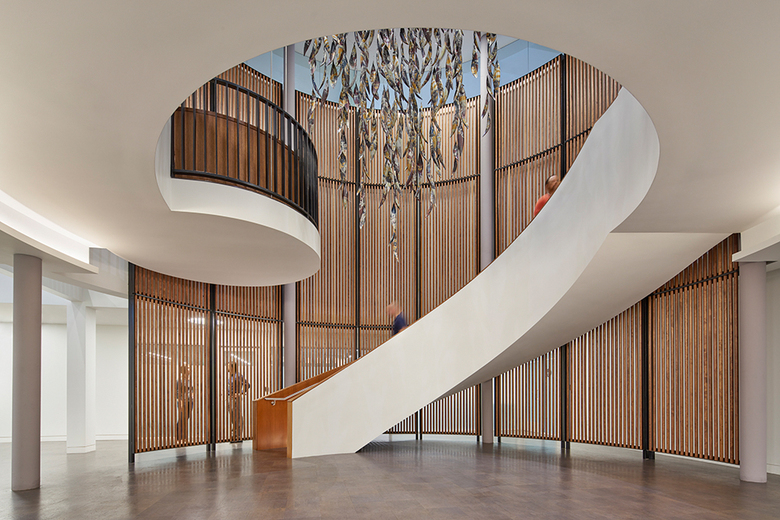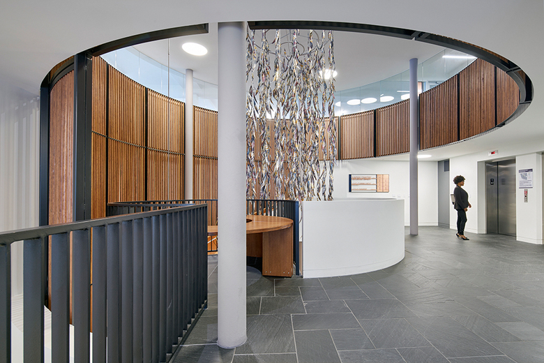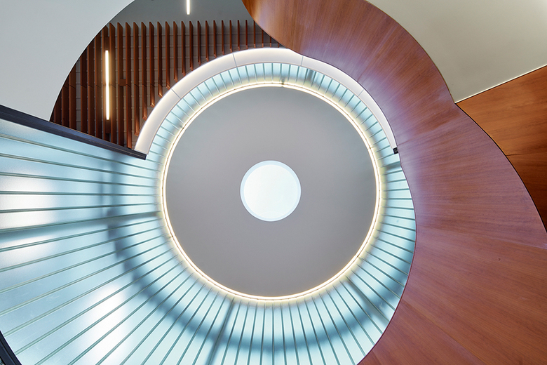 The LEED Platinum building in an expression of the center’s vision for a connected, open, and democratic world. This circular volume carries an open stair upward through the building’s original three floors to a fourth-floor addition, linking floors and connecting a range of workspaces. Throughout the building, the circular volume acts as an organizing and integrating principle, linking the various floors and functions while maintaining the separations needed to meet code and maintain privacy.