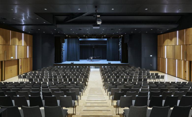 Schon auf der Eingangsebene entfaltet der Theatersaal die neue räumliche Freiheit: ein abgesetzter Boden zeichnet dort seine Silhouette nach. Verstärkt wird dieser Effekt wiederum durch den Einsatz von Lamellen: aus heimischer Eiche gefertigt bekleiden sie die Wände und verbinden visuell Innen und Außen sowie die Ebenen innerhalb der Halle. Die Lamellen ziehen sich vom Eingang bis zum Bühnenturm hinauf, wo das harmonische Zusammenspiel von Architekten und Innenarchitekten in gewisser Weise seinen Höhepunkt erfährt: Das helle, warme Eichenholz kleidet die Wände des Theatersaals und bildet einen schönen Kontrast zur ebenfalls neugestalteten und gänzlich in Schwarz gehaltenen Theaterbühne und Saaldecke.