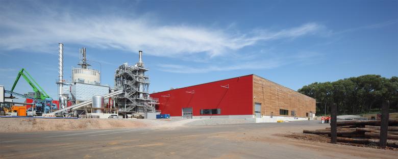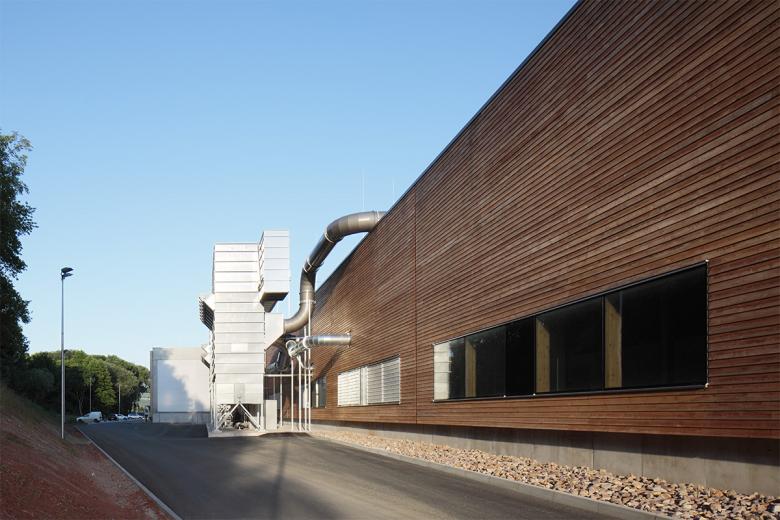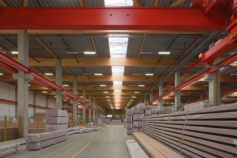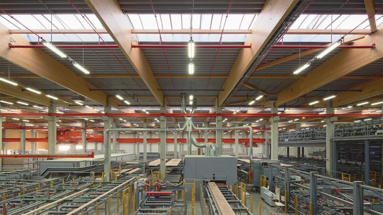 Die über 200 m langen Aussenfassaden des Produktionsgebäudes bestehen aus vorgefertigten Holzelementen aus naturbelassenerr Lärche. Die Rundholzaufgabe und die technischen Anlagen haben eine Fassade aus feuerroten Metallpaneelen. Im Inneren überspannen schlanke Brettschichtholzbinder die Hallenschiffe und ermöglichen zahlreiche Erweiterungen.