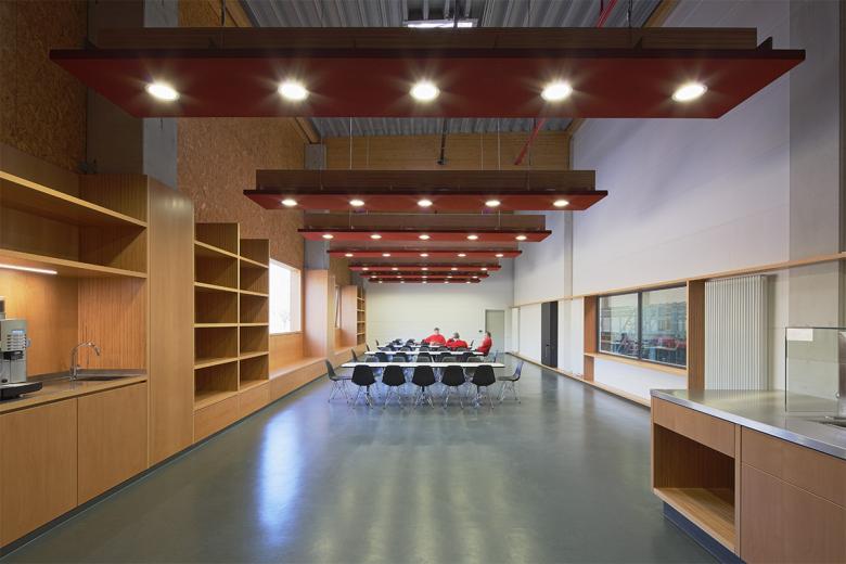 Eine große Herausforderung stellte der produktionsbedingte Wärmeüberschuss dar. Im Werk durchlaufen die Holzstämme von der Rundholzaufgabe bis zum fertigen Furnierschichtholz quasi verschiedene extreme ‚Klimazonen‘. So gibt es produktionsbedingt tropisch feucht-heiße Abschnitte und Bereiche mit trockenem, heißen Klima. Zusammen mit Transsolar (Stuttgart) wurde ein Konzept erarbeitet, das allein über natürliche Be- und Entlüftung bei laufender Produktion in den Bereichen, in denen sich Mitarbeiter aufhalten, ein angenehmes Innenklima gewährleistet.