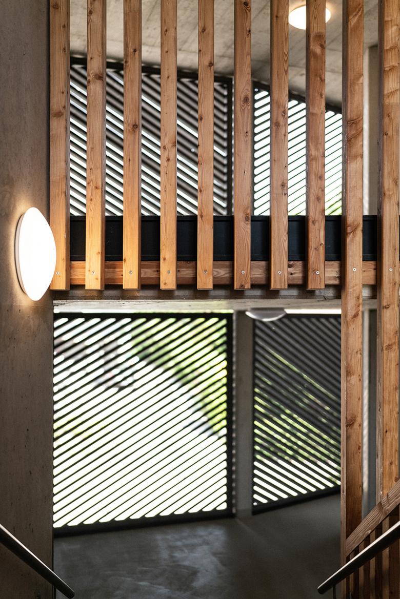 Die beiden Wohnhäuser sind über eine gemeinsame Erschließungsfläche miteinander verbunden – hier bildet die Treppe den Gelenkpunkt. Durch die Absturzsicherung aus naturbelassenem Lärchenholz wirkt sie skulptural, kreiert reizvolle Spiele aus Licht und Schatten und wird zu einem Blickfang im Innenhof.