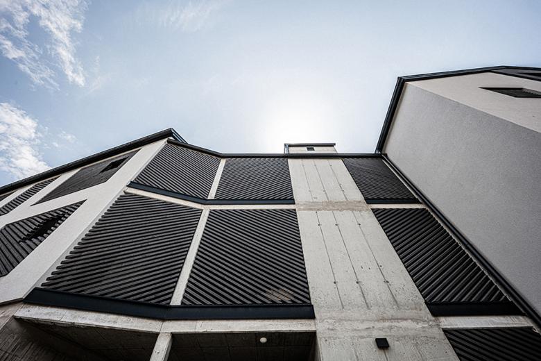 Das Objekt wurde ab dem ersten Obergeschoss in Holzmassivbau realisiert und mit einer modernen Rhombus Fassade aus regionalem vorvergrautem Lärchenholz verkleidet.