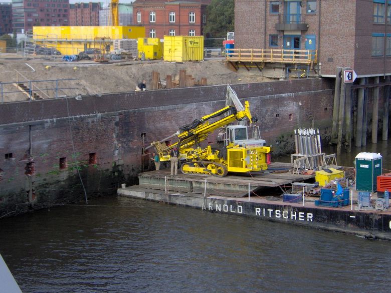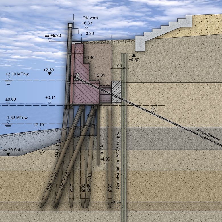 Der Zahn der Zeit hat dort am äußeren Erscheinungsbild der historischen Kaimauer, die seit über 100 Jahren den ständigen Beanspruchungen aus Erddruck und den wechselnden Wasserständen ausgesetzt ist, genagt. Jetzt wurde die in die Jahre gekommene Kaimauer technisch und optisch instandgesetzt, damit sie auch künftig ihren Anforderungen gewachsen ist. Die vorhandene Sickerschürze aus Holz ist durch eine zeitgemäße Stahlspundwand ersetzt und in Teilbereichen mit Verpresspfählen rückverankert. Im Zuge der Instandsetzung wurde das vorhandene Mauerwerk erhalten. Einige schadhafte Stellen wurden unter Berücksichtigung des Denkmalschutzes erneuert. Die Oberfläche des neu erstellten Mauerwerks wurde künstlich gealtert, um in naher Zukunft ein gleichmäßiges Erscheinungsbild für das gesamte, zum Teil neu gestaltete Umfeld zu erreichen. Die Kaimauer ist nun wieder gut gerüstet für die nächsten 100 Jahre und wird dem Betrachter wieder viel Freude bereiten.