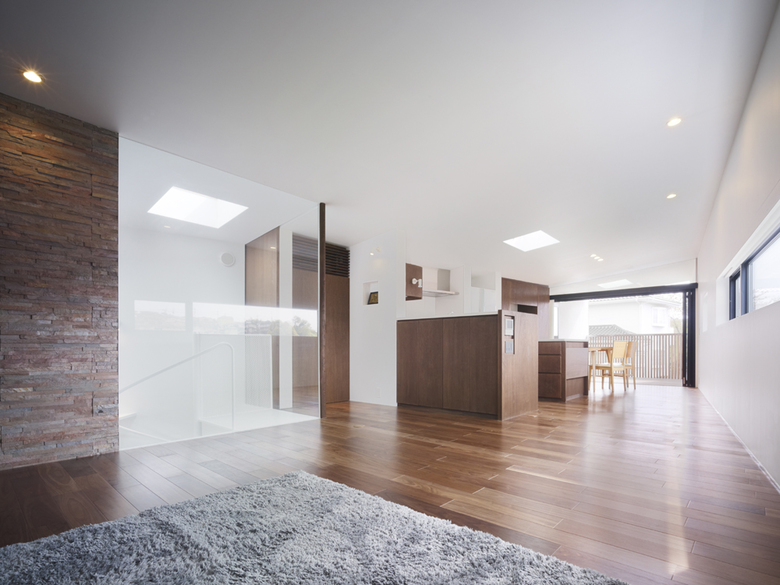 Looking at the site from the main road running along the west side, one can see beyond the rice paddies a north-south retaining wall about 8 meters high, and on the slope above it, a row of houses in a residential area continues. The existing retaining wall looks as if it were a platform for this house. Although the site is not large, we believe we have succeeded in creating a house that is in harmony with the surrounding environment and gives the impression of a large scale.
