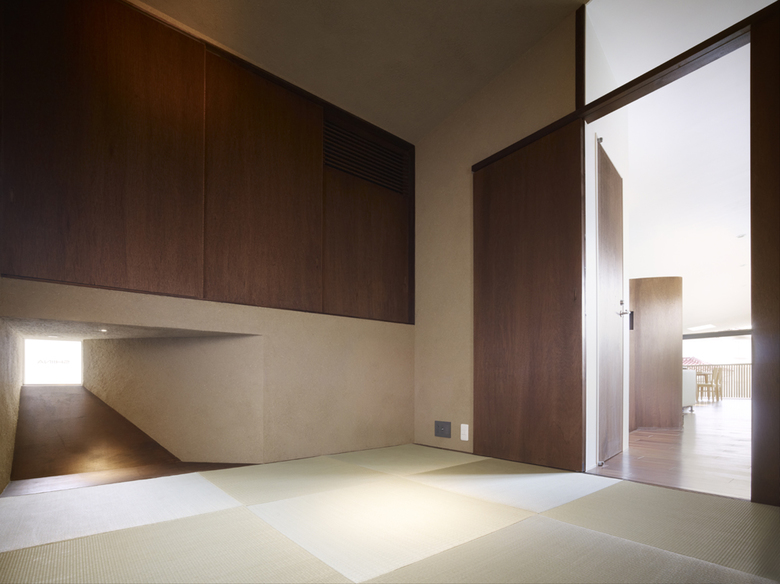 The wooden ground floor is placed on top of the basement, which is dug into the retaining wall. The first floor, which required a large area, overhangs the basement to the south. This part is reinforced with steel braces. The above-ground portion is a tubular space that varies in width and height while being continuous in the north-south direction. The west wall has a horizontal slit window, through which a limited view of the landscape is shown. The space directs the viewer's attention to the south.