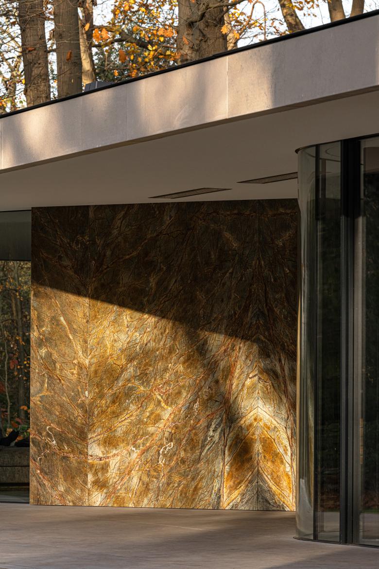 While the heavy stone volumes and austere straight lines recall a serene retreat, the curved lines and glass walls evoke the lightness of being. The latter emerges especially in the living room, which is bounded entirely by glass. Only one small section, detailed in the facade in richly veined marble, is closed. Simple white plaster surfaces and carefully crafted built-in furniture elements enhance the uncluttered esthetic.