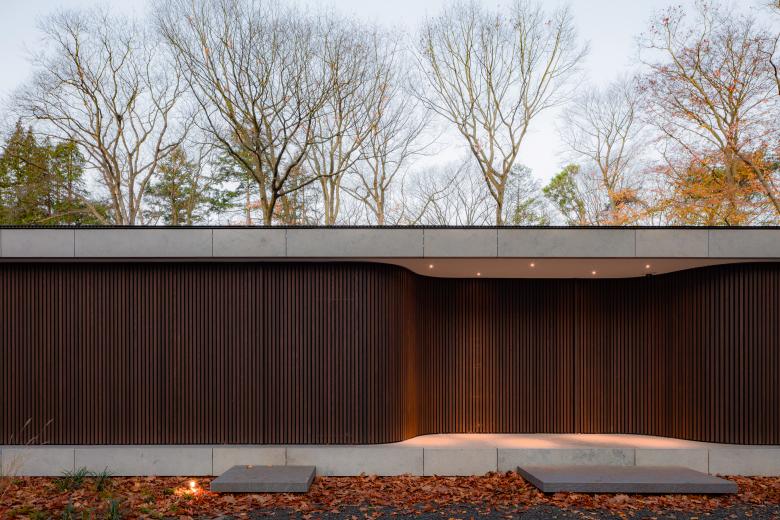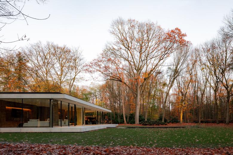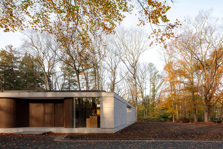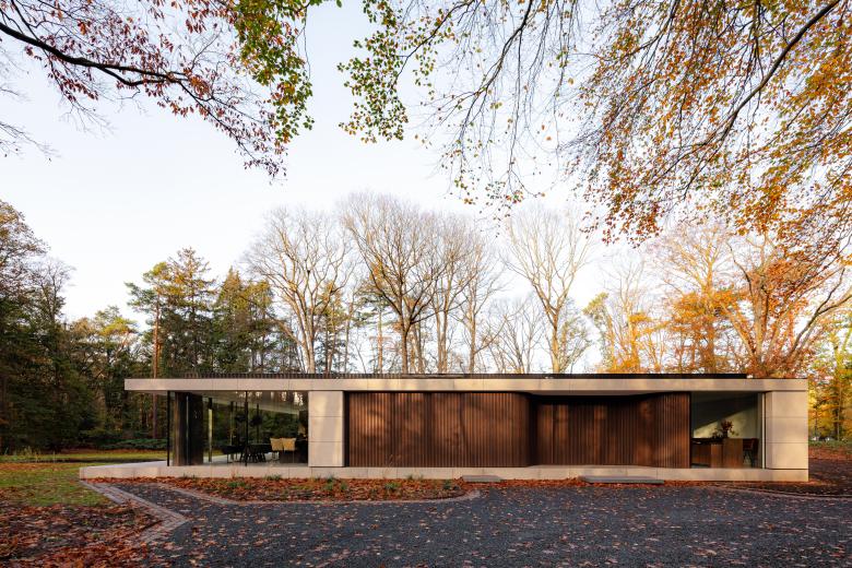 Based on an elongated U-shaped floorplan, our Villa JM presents a secretive stone face to the world, revealing only a tantalizing glimpse of its inner world in the shape of its central courtyard. Inspired by the location, an extensive wooded site in the south of the Netherlands, we discreetly positioned expanses of glass to offer our clients the best of the natural views, while closed volumes safeguard their privacy. Natural stone and wood add depth to our elementary one-story design, which pairs sober straight lines and monumental volumes with seductive curves and sinuous glass walls.