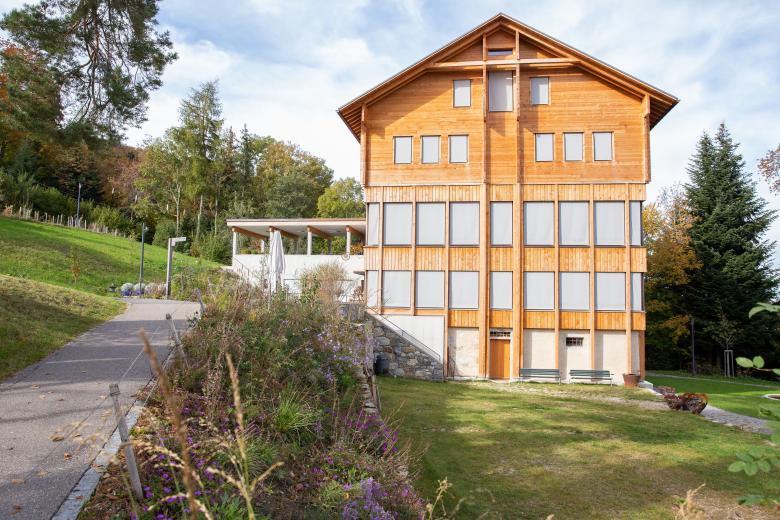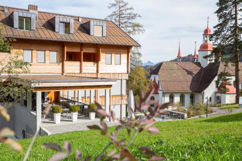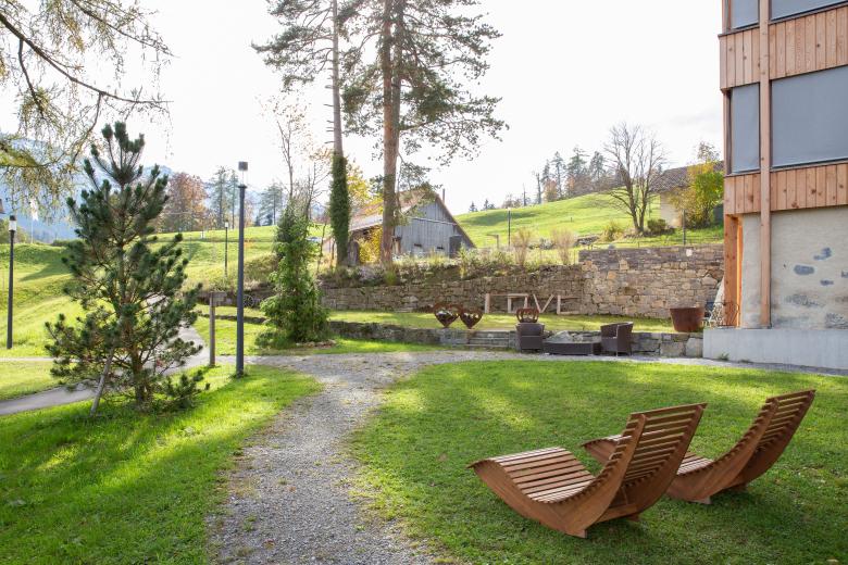 Die direkt dem ganz in Holz gehaltenen neuen Gasthaus angegliederten Aussenräume sind nutzerorientiert und barrierefrei angelegt: Eine weitläufige Terrasse mit Hartbelag (Natursteinplatten) wird für die Aussenbewirtung genutzt, eine naturnahe Wiesenterrasse mit Zierbecken bildet einen harmonischen Übergang in die Landschaft.