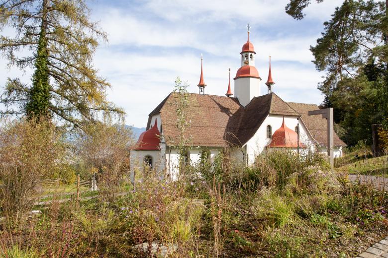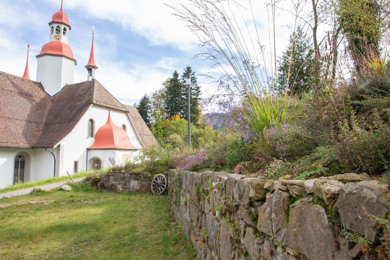 Diverse ökologisch wertvolle Trockenmauern, einheimische Sträucher sowie Kies- und Extensivflächen bieten Kleinlebewesen Nischen und Rückzugsorte und verleihen der Anlage eine natürliche, dem Ort adäquate Ausstrahlung. Die stolze Erscheinung der Kirche mit Loretokapelle, des Wirtschaftsgebäudes und des Gasthauses unterstreichen Solitärbäume wie Fichten aus Bestand, Ersatzpflanzungen von Ahorn bei den neu organisierten Parkplätzen sowie zahlreiche charaktervolle Stauden und Gehölze.