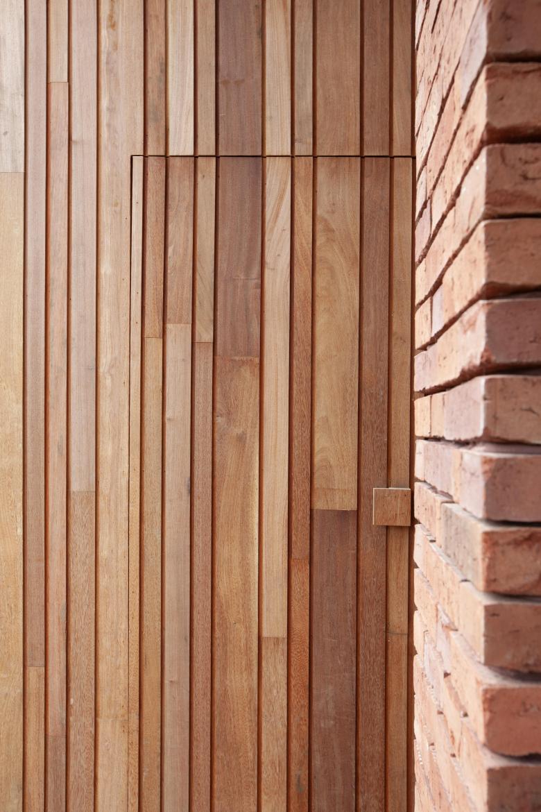 Ook de voorgevel manifesteert zich gesloten op het gelijkvloerse niveau om geborgenheid en privacy te bieden. Een patio naast de bureauruimte aan de straatzijde zorgt toch voor een rijke daglichtinval in deze werkruimte. De patiomuur begeleidt bezoekers naar de inkomhal. Ter hoogte van het hoofdgebouw is de muur opengewerkt en beidt zo een zichtlijn door het bureau.