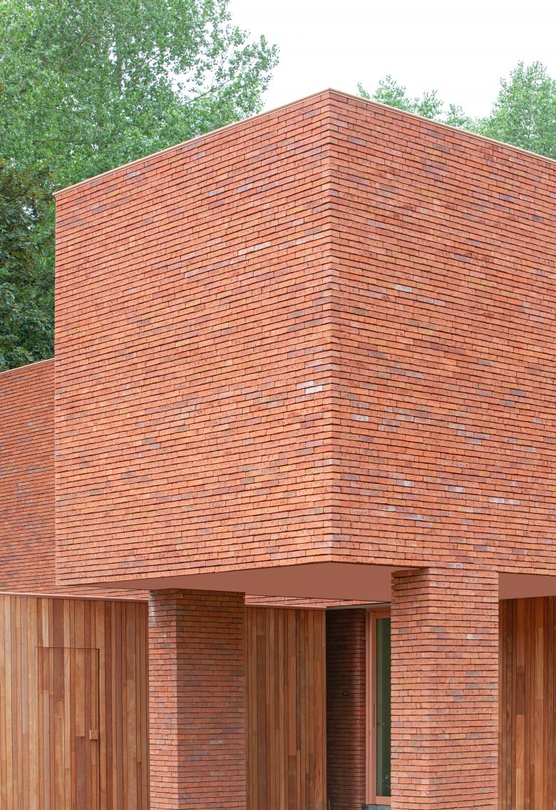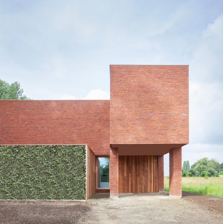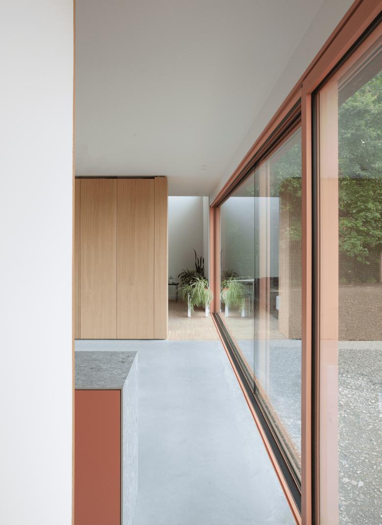 Het grondplan van dit ontwerp respecteert de schuine lijn van de linker perceelsgrens. Het nauwgezet volgen van die grens trekt de leefruimte open naar de achtertuin. De vrij gesloten gevel en een bijgebouw met een polyvalente ruimte verzekeren de nodige geborgenheid ten opzichte van de buur aan deze zijde van het perceel.