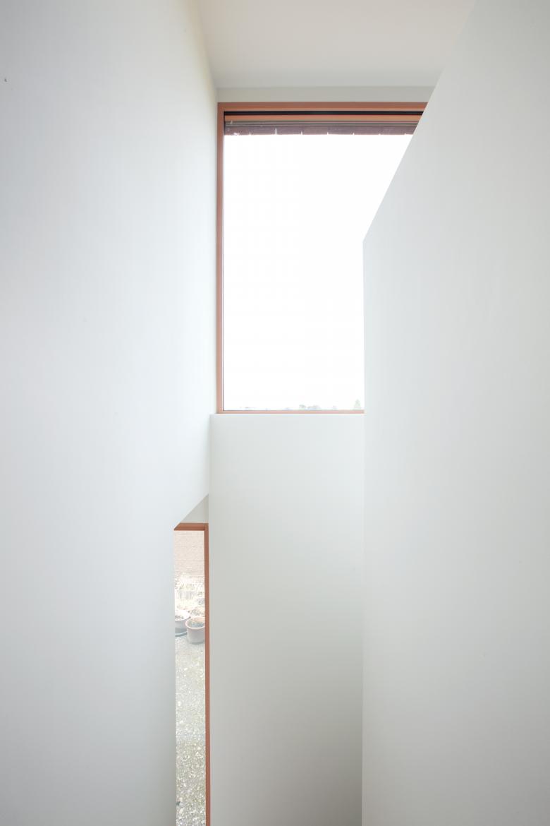De inkomzone is ruimtelijk dankzij een vide die op de verdieping in de voorgevel een royale glaspartij heeft. Zo vindt de ochtendzon zowel een weg naar de zitruimte als naar de nachthal en de aanliggende slaapkamers.