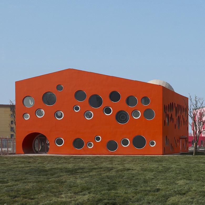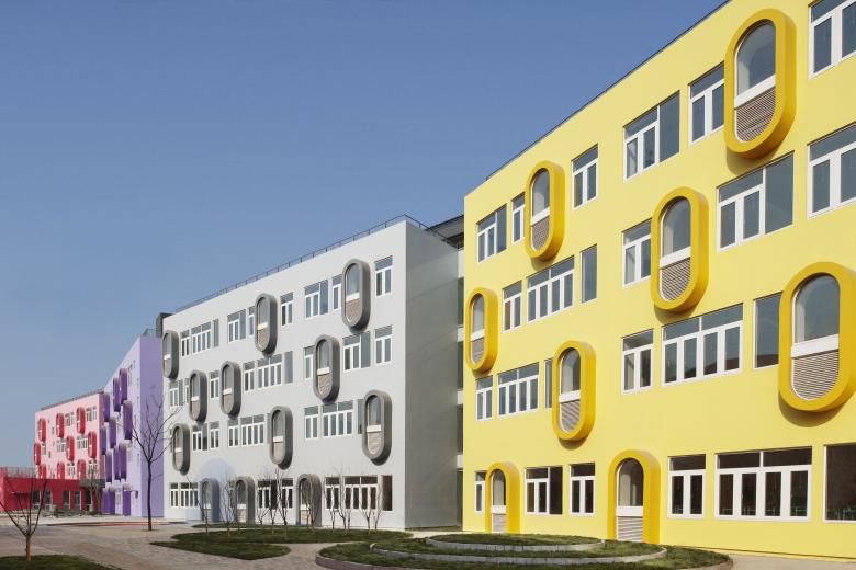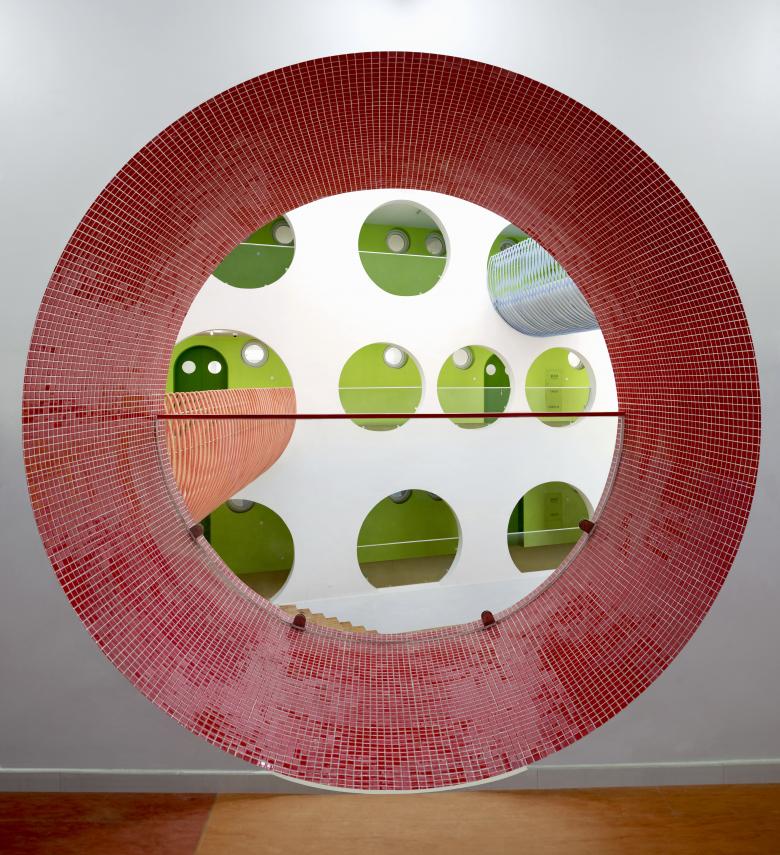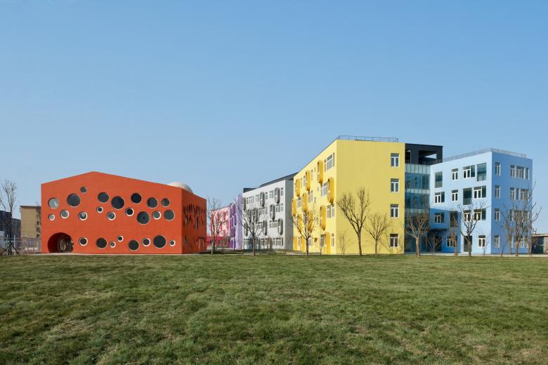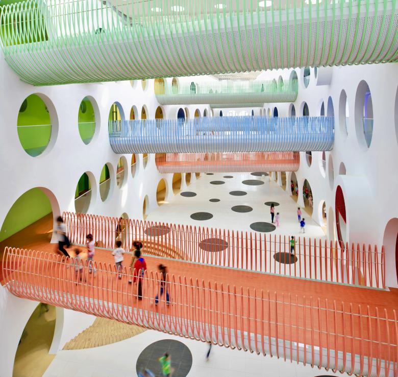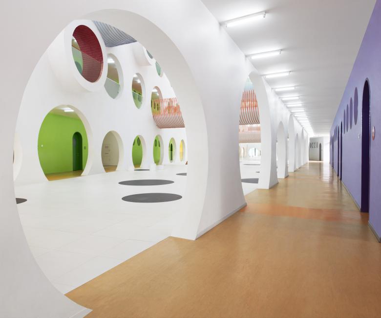 The elementary school consists of eight volumes that house the regular and special classrooms. These volumes are divided into four levels and arranged in a zigzag pattern. To connect the classrooms across the corridors, twelve bridges are suspended at various angles between the facing volumes. Each volume and each floor has a different color, creating 32 distinct places with diverse combinations. This adds variety and identity to the school architecture, like the 32 team colors.