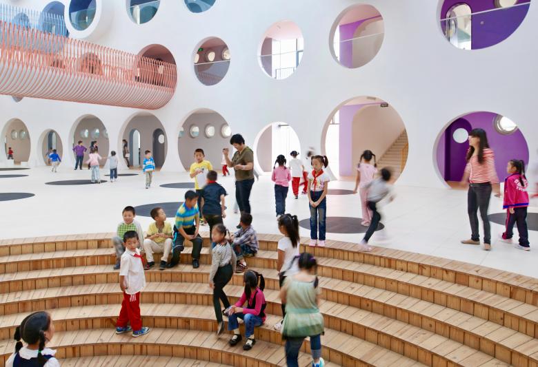 During recess, children move through the atrium in groups, filling the space with their lively voices.