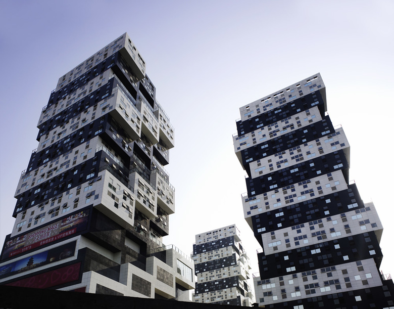 Accumulation Incline / Shift – An integrated project with 4 residences as well as a commercial building. The whole project is rotated 45 degrees from the north south axis. The design guarantees not only moving lines that flow from the 4 angles to the central business area, but also provides optimum sunshine for every building. The Residence building is 80m high. The setback areas are used for terraces. The upper building massing varies by stacking small scale volumes together. Setbacks are also used for a restaurant terrace on the 6th story of the commercial building to enhance the dynamics of the facade.