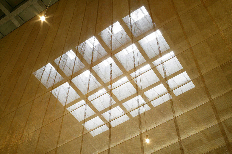 Besonderheiten und technische Innvoationen: Massive Hülle aus einem Baukastensystem von 3.200 Beton-Formsteinblöcken mit 140 unterschiedlichen Steintypen (1,20 m x 0,60 m x 0,60 m), Dach als Trägerrost, im Inneren die durchscheinende Hülle des Sakralraumes aus einem „gestrickten“ Messinggeflecht