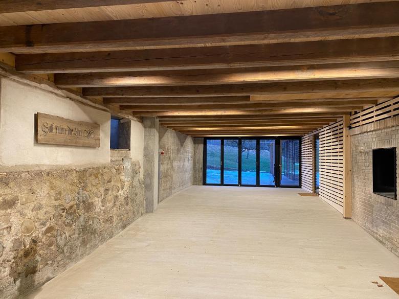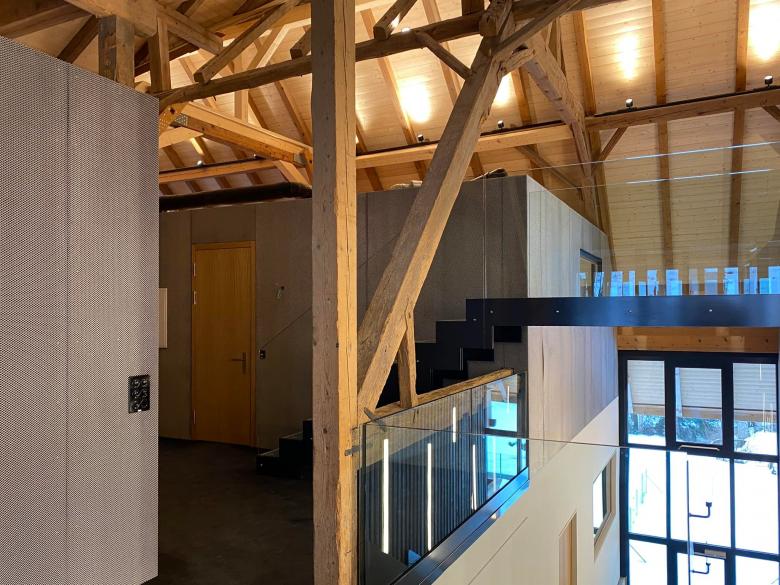 Umbau und Erweiterung eines unter Denkmalschutz stehenden Bauernhaus. Öffnung einer vertikalen Achse und Einbau von wärmegedämmten Kuben im offenen Volumen.