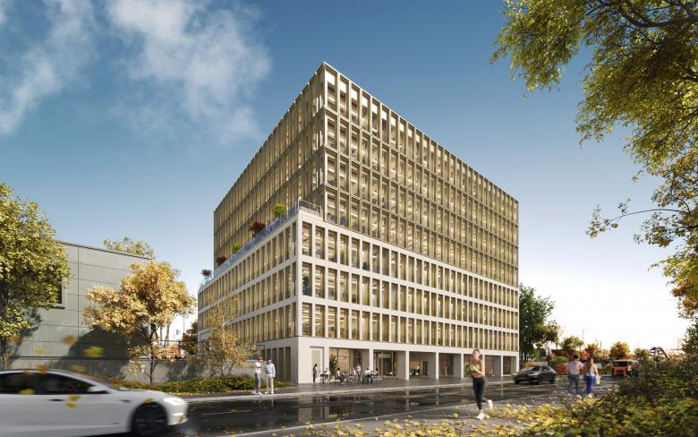 Der achtgeschossige Büroneubau, dessen Holzkonstruktion oberirdisch nur an wenigen Stellen durch Stahl und Beton ausgesteift wird, verfügt über ein offen gehaltenes, einladendes Foyer, Gastronomie- und Gewerbeeinheiten im Erdgeschoss und flexibel gestaltbare Büroflächen.