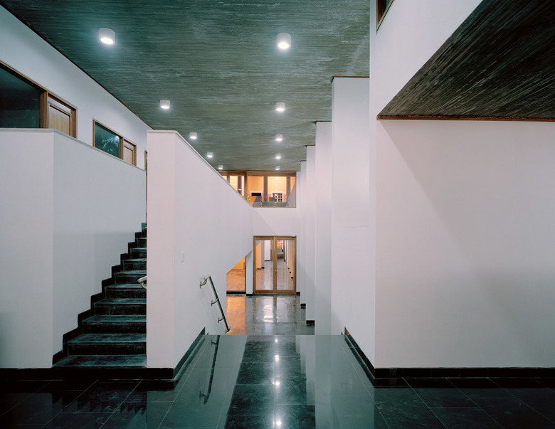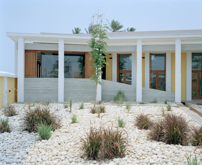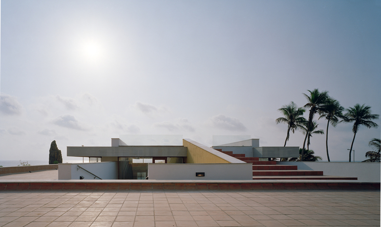 The central axis was extended to the seashore and offers transparency from the entrance court to the sea through 90 m of built masses and courtyards. The lay with the internal floors are spit levels to give several views of the garden and horizon line of the sea.
