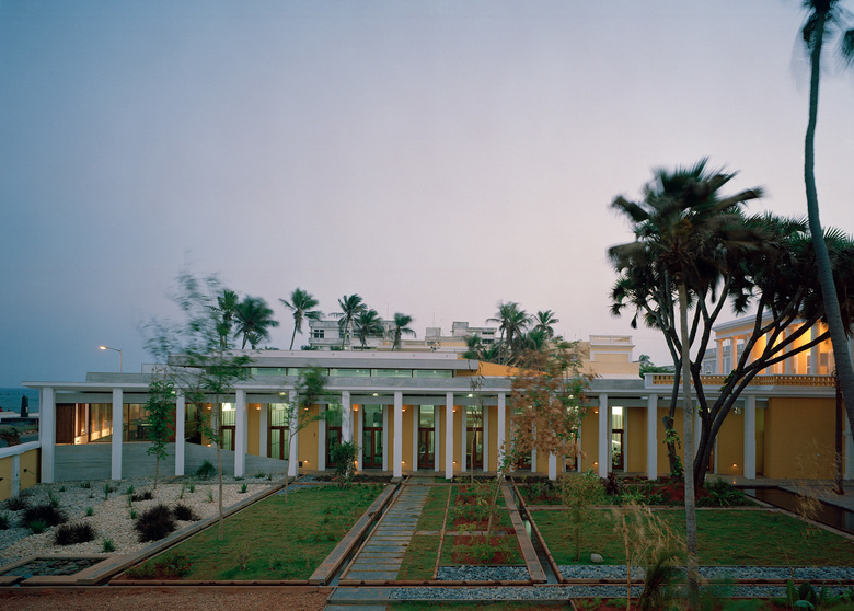 The existing building, facing the Indian Ocean, is one of the most remarkable structure of the french part of the city. The plan is based on a typical XVIIIth century "hotel particulier, entre cour et jardin "plan with a axis, symmetry & the center and small transparency between courtyard and garden, large rooms in on the sides. The concept was to reinterpret these composition rules and scale for a contemporary project.