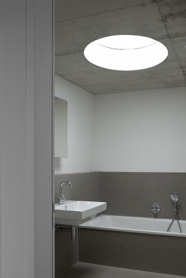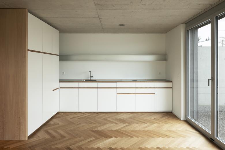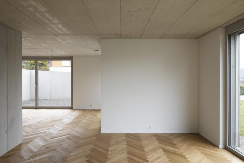 Neben dem gedeckten Hauseingang werden im Erdgeschoss ein Entree mit angrenzendem Wohnraum und offener Küche, ein Disponible und ein Gäste-WC angeboten. Der vorgelagerte Aussenraum wird durch den introvertierten Hofraum mit anschliessendem gedeckten Sitzplatz und vorgelagertem Garten gegliedert. Im Obergeschoss befinden sich drei Individualzimmer mit dazugehörigem Badezimmer, im Attikageschoss der Masterbereich mit Bad, Zimmer und davorliegender Dachterrasse.