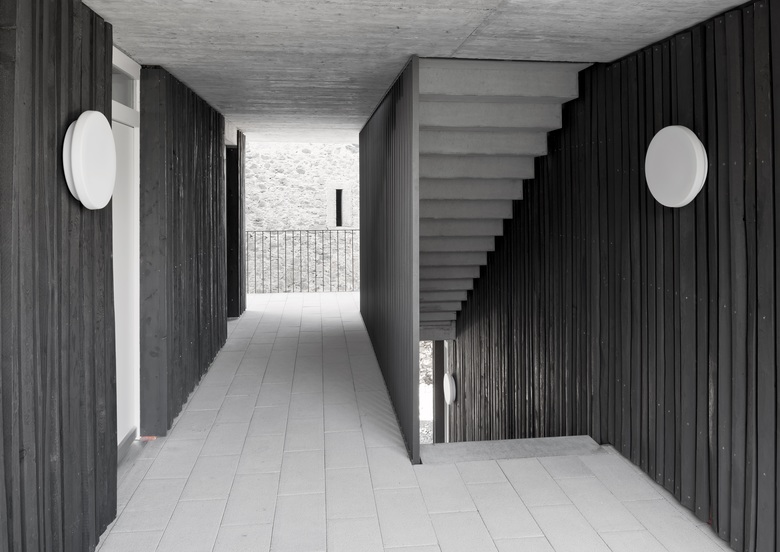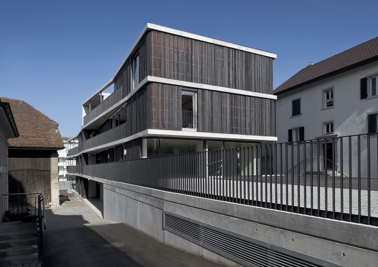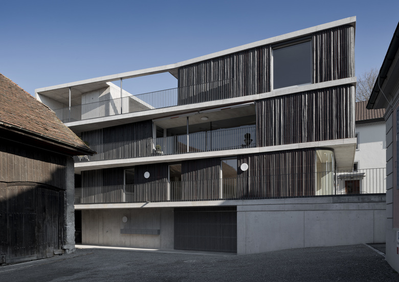 In Anlehnung an die Schopf- und Stallgebäude der angrenzenden Steingasse-Zone, sind die Fassaden mit senkrechten dunkel gestrichenen und geschälten Schwartenholzbretter verkleidet. Die Rauheit der Holzbretter steht im Kontrast zur Feinheit der Verglasungen und der Flachstahlgeländer, welche sich als schwarze Bänder durch die Geschosse ziehen.