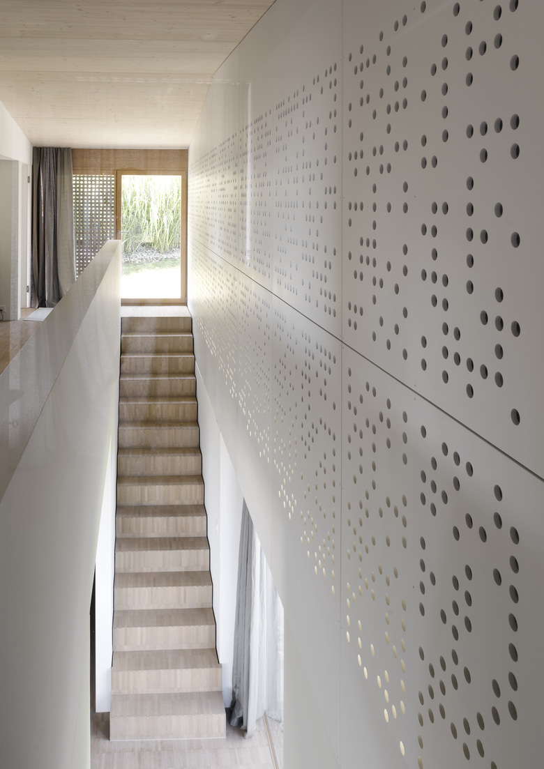 Das Thema der Perforation wird im Innenraum an der treppenbegleitenden Wand weitergeführt und bietet durch die Hinterleuchtung eine Grundausleuchtung des Treppenraums. Die Materialisierung bleibt mit dem kleinmasstäblichen und grau geseiften Klötzliparkett, dem feinen Abrieb der Wände, den weiss gelaugten Holzdecken und den Mosaiksteinzeugbelägen in den Nassräumen zeitlos und zurückhaltend. Der Wohnraum wird durch die freistehende Kücheninsel strukturiert, die Küchenrückfront mit den Apparaten lässt sich hinter raumhohen Schiebeelementen komplett schliessen.