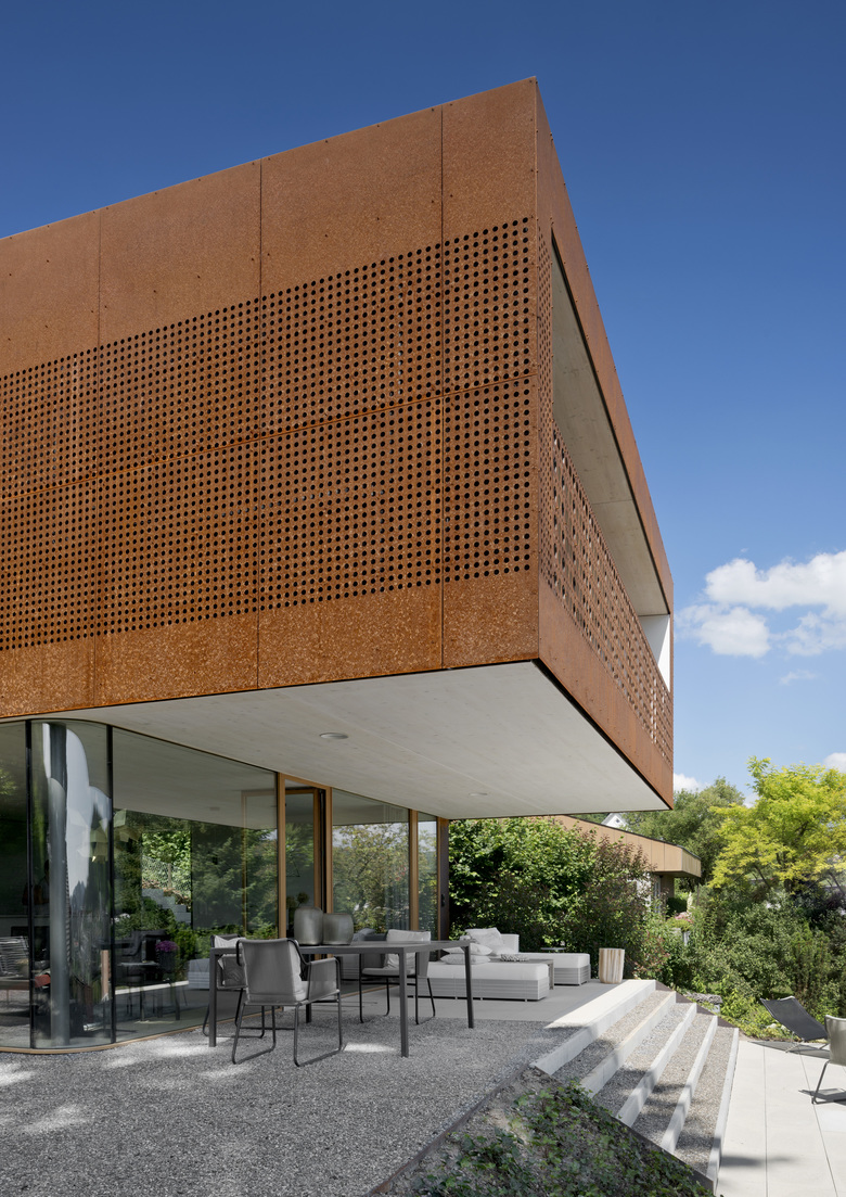 Das bestehende Haus wurde bis auf das Untergeschoss rückgebaut. Das Untergeschoss in Massivbauweise wurde baulich angepasst und beherbergt neu das Wohn- und Esszimmer mit rückgelagertem Individualzimmer. Talwärts wurde das Wohnhaus mit neuen Keller- und Technikräumen, sowie einem internen Treppenhaus, welches ab dem neuen Hauszugang Bergliweg kaskadenartig dem Hang folgend, erweitert. Der Pool befindet sich höhenversetzt südseitig vor dem Wohnraum und liegt direkt über den gedeckten Einstellplätzen. Das neue Obergeschoss, in welchem drei weitere Individualzimmer untergebracht sind, wurde in Element-Holzbauweise erstellt und mit einer teilweise perforierten Cortenstahlfassade, welche sich in den Schiebeläden mit gleicher Verkleidung fortsetzt, ergänzt. Durch die grosse Auskragung des Obergeschosses bietet sich vorgelagert zum Wohnzimmer ein grosszügiger, gedeckter Aussenraum.