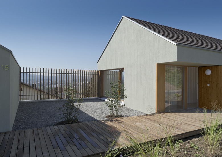 Die lange schmale Parzelle parallel zum Hang wird von der oberen Hangseite erschlossen, die Hangneigung der Bautiefe beträgt mehr als ein Geschoss und die Bauzone erlaubt nur Steildächer. Die Anordnung der verschiedenen Nutzungen erfolgte additiv parallel zum Hang. In der oberen Zugangsebene, gliedern der Hauptbau und der Garagenbau das Umgelände in unterschiedlich orientierte und verschieden besonnte Aussenräume.