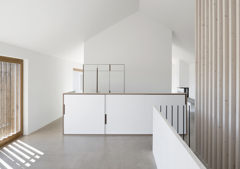 Der Wohnbau ist als ein Raum mit Dach und mittigem Kern, welcher Wohn- und Essraum/Küche räumlich gliedert, ausgebildet. Durch einen raumhohen Holzfilter entlang des Treppenabgangs wird das Entree zusätzlich räumlich definiert. An der nordseitigen Innenwand verläuft eine Betonbank über die ganze Raumlänge, sie bietet im Entree Sitzmöglichkeit und wird zum Wohnraum hin, zur Ofenbank mit Feuerstelle. Über eine einläufige Treppe wird das darunterliegende Zimmergeschoss, mit zwei Individualzimmern und dazugehörigem Nassraum, sowie hangseitigen Keller- und Technikräumen, erschlossen. Der Garagenbau bietet im oberen Geschoss Platz für zwei Autos, im darunterliegenden Geschoss einen Raum für Gartengeräte.