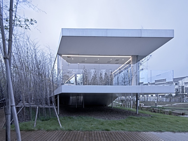 Responding to the horizontal feature of surrounding landscape and trees in site, the building is made into a linear and folded form. It zigzags and flows, sometimes approaching the ground, sometimes floating in the air. While inside it provides to visitors various views at different level and angle, it also gives an impression that architecture is touching the site in a very “light” form, thus creating a subtlety. The soft soil geo-condition of the site also makes this floating form structurally reasonable since slim columns on pile foundations support the building.