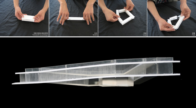 The design therefore takes Mies’ Farnsworth as a prototype concept and creates a new form through a series of actions on it: stretch, loop, and fold. These actions lead to following results: smaller building depth with better views, introversive courtyard space offering more privacy, getting closer to water and accessible roof as extension of landscape. The transparency dematerializes architecture. The concern to physical form of building is replaced by desire to create flowing and see-through space to maximize visitors’ experience of natural environment outside.