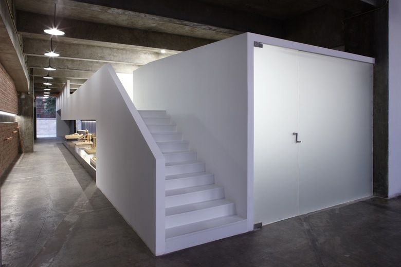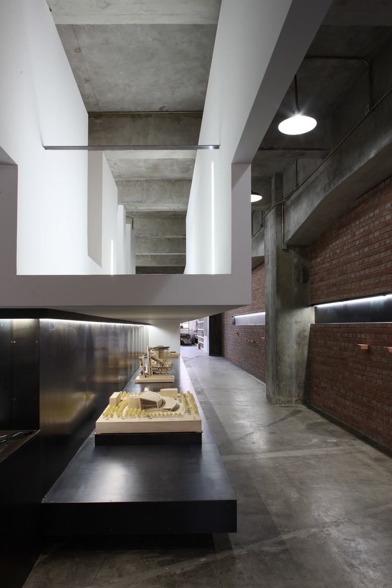 While the major materials used for new elements are steel plate, frost glass, white gypsum board wall and vinyl floor to create abstraction of pure volume, the original material of existing elements such as concrete, steel and wood is re-exposed by removing the paint so as to emphasize its tectonic. Thus a strong contrast is created between the abstraction of new element and heavy textured existing structure.