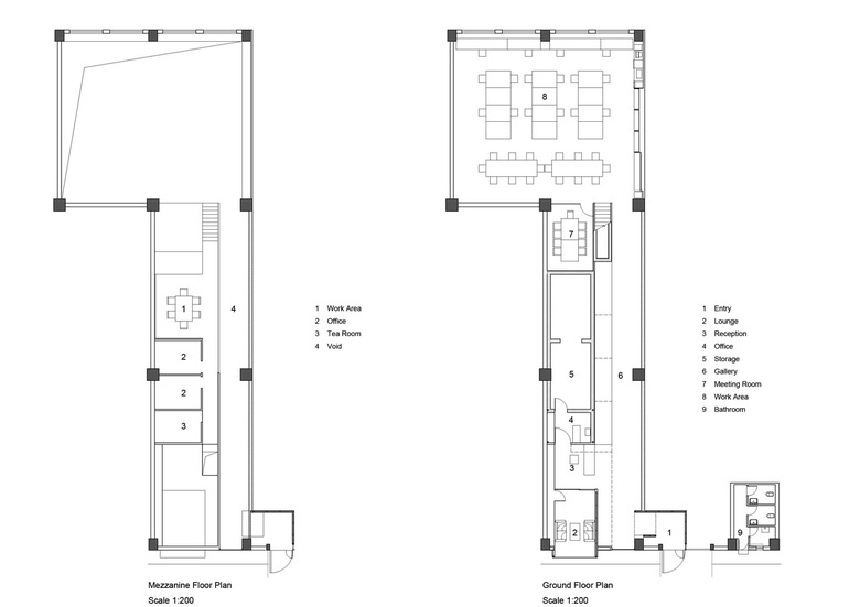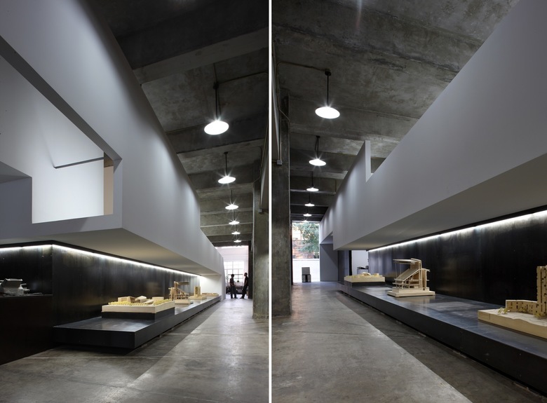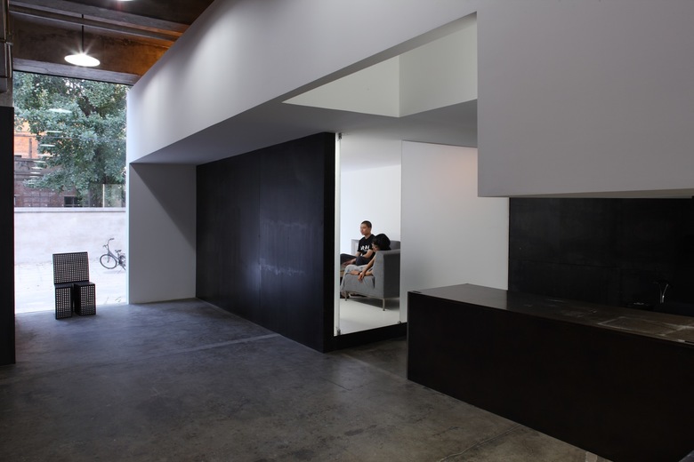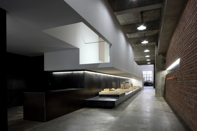 Located in an aeronautical factory on North 3rd Ring of Beijing, the existing warehouse is a three bay 36 meter deep concrete structure, with 4 meter high space in first two bays and 7.8 meter space in last bay. The key issue of design is to preserve the full height space for work area by inserting a mezzanine floor in 4 meter high space, creating extra work area on top and storage space underneath it. The contrast between very low space on mezzanine and very high space of main area generates a spatial tension. A niche underneath the cantilevered floor functions as the model displays. The original facade is demolished and changed into full height glazing to reveal the inserted white volume of intervention. The lounge room, as a new element, is projected out from facade and turned into a showcase.
