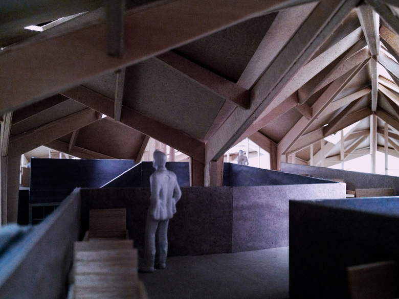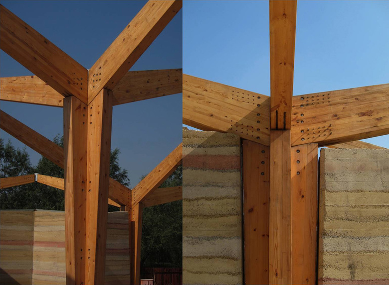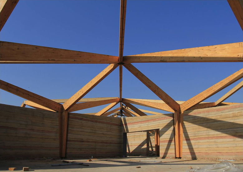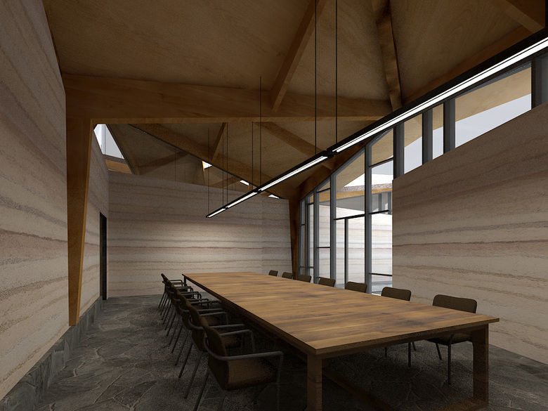 The architecture is mainly constructed from wood and rammed earth. These materials are able to breath, adjusting the relative humidity and temperature of indoor and outdoor areas, and will biodegrade in the future. Glass curtain walls are filled between timber structures and rammed earth walls on facades, providing the experience of being in the manmade and natural forest at the same time.
