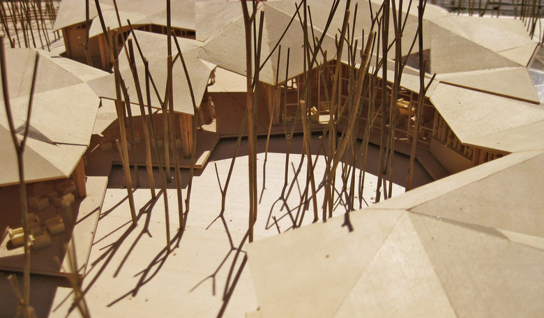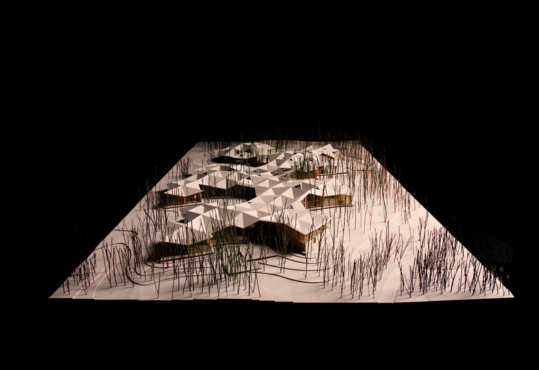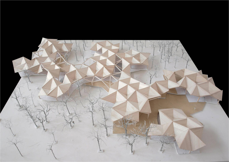 The structure is made from the repetition of a basic unit, a tree like column with four cantilevered beams that varies on height. The plan is based on a zigzagging grid that is capable of adapting to the site and existing trees and achieving flexibility during the different construction phases.