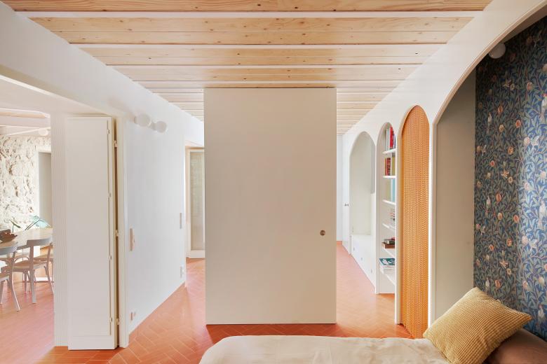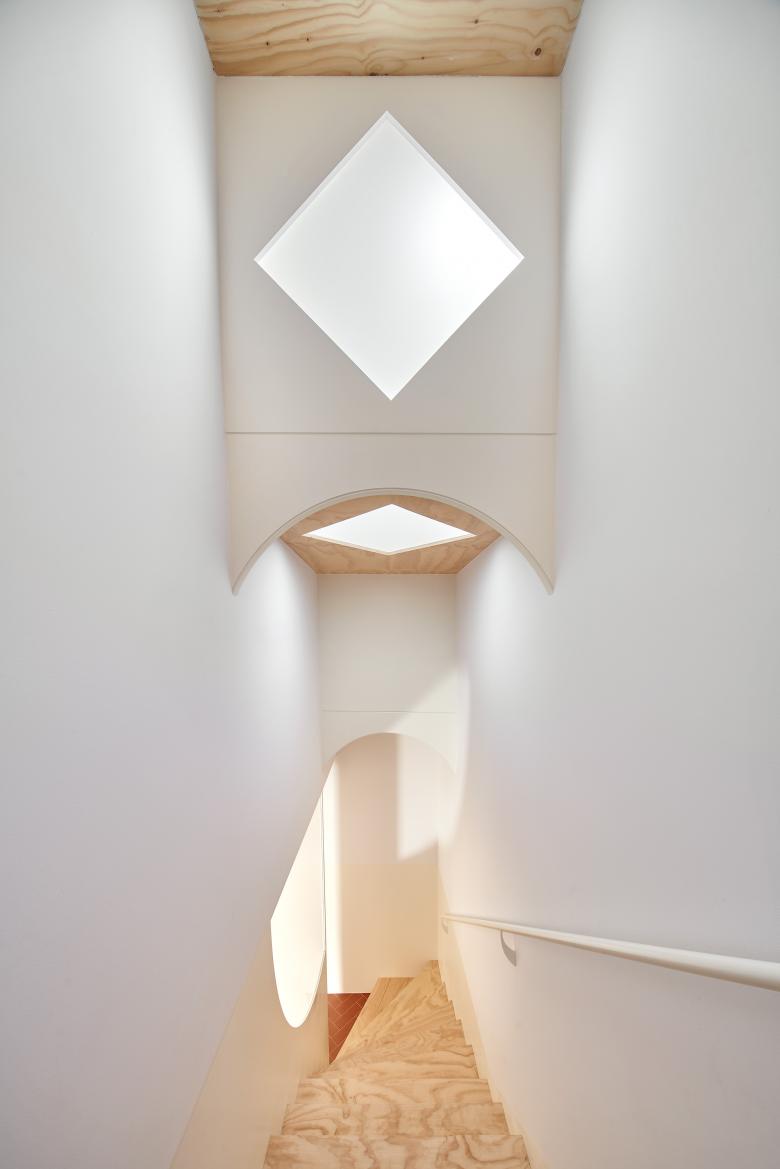 El interior de la casa reformada se organiza en tres bandas. Primero un espacio longitudinal paralelo a la terraza. Lo acompaña un retablo formado por una sucesión de nichos, un fondo poroso que acomoda muebles y espacios de servicio. Finalmente, detrás de él se sitúa la escalera longitudinal que extiende la vivienda inferior a la última planta.