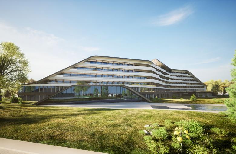 The curvilinear shape that characterizes the hotel's layout stems from the desire to follow the contours of the lake's coastline. From the floor plan, the curves become three-dimensional, defining the building with planes flexed into soft lines that embrace the volumes of the structure. While the curved planes create the solid parts of the structure and the roofs, all the vertical closures that form the skin of the interior spaces are marked by the lightness of the glass.
