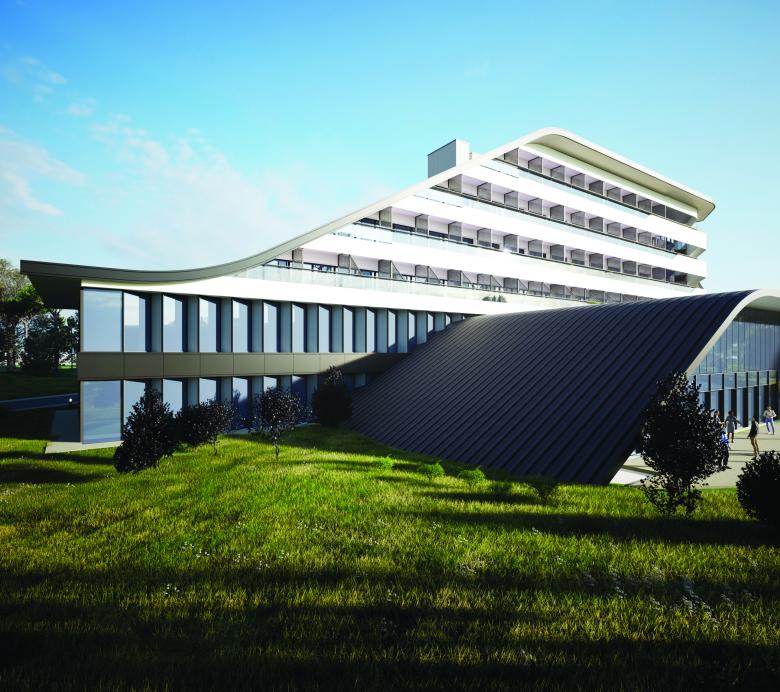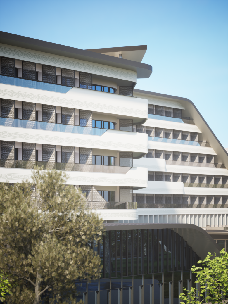 On the building's entrance, the façade delimiting the corridors of the guestroom floors is treated with a random alternation of glass and opaque panels. The continuity of this pattern and its sinuous structure is interrupted at two points by the solid, vertical white volumes that house the connecting systems.