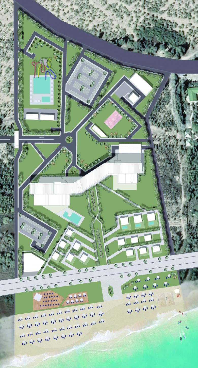 The master plan includes a 100-room hotel, including all services and common areas, as well as five independent villas in the area overlooking the beach.