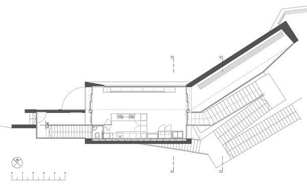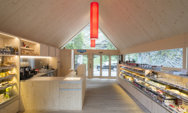 Den rund 40 m2 grossen Raum des Besucherzentrums mit Kassabereich und Verkaufsfläche überspannt ein leicht asymmetrisches Giebeldach. Während der Bau zur Strasse und zur Schlucht hin geschlossen wirkt, ist die Süd- und Nordseite des Gebäudes mit grossflächigen Fenstern versehen. Diese raumhohen, strukturellen Öffnungen rahmen die eindrückliche Landschaft. Ein schmales Trichterfenster ermöglicht die Einsicht in das Besucherzentrum von der Strasse her. Das Materialkonzept mit Beton, Holz und Stahl reagiert auf die archaische Umgebung der Schlucht.