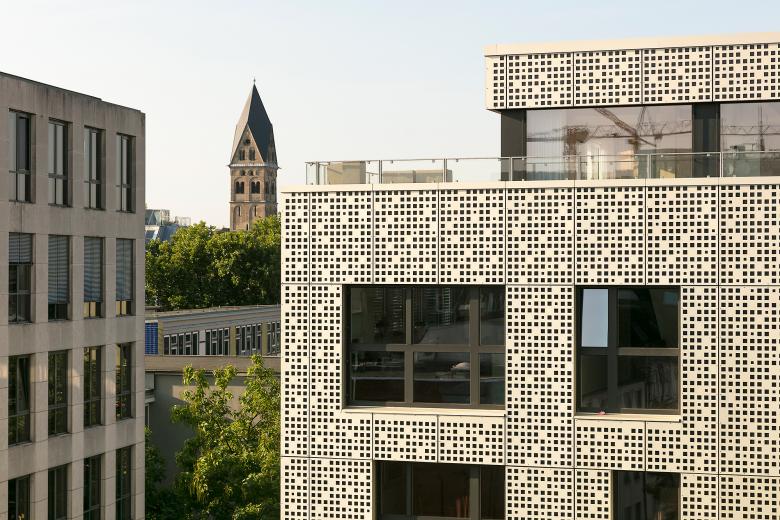 Die bisher von der Autonutzung geprägte innerstädtische Situation der Magnusstraße wird durch die schillernde, perlbeige Fassade zurückhaltend und doch signifikant aufgewertet.