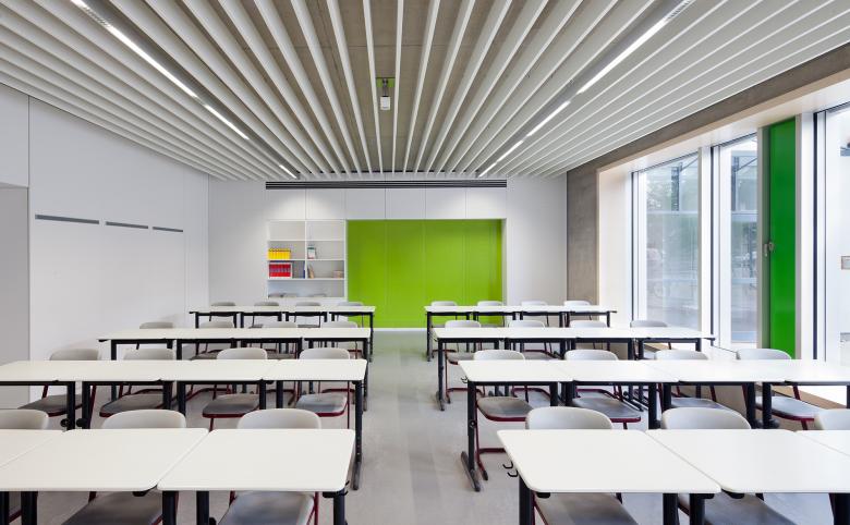 Die Kennwerte für Heiz- und Primärenergie entsprechen Passivhausstandard. Die Baumaßnahmen erfolgten parallel zum laufenden Schulbetrieb.